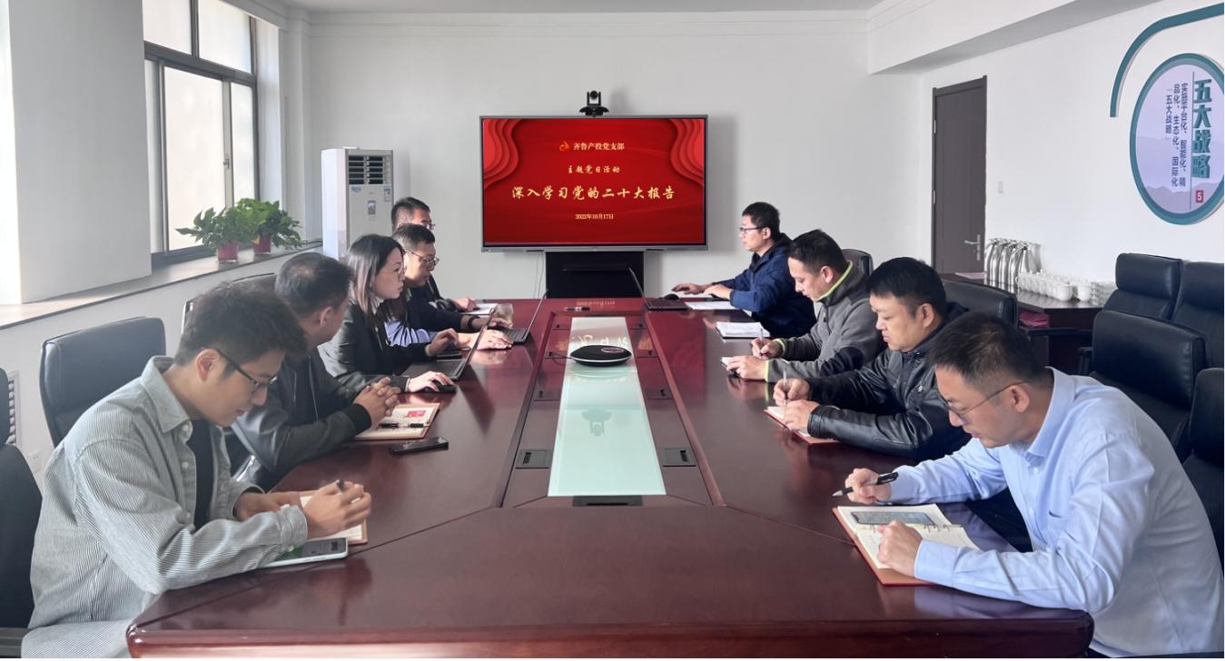 為深入學(xué)習(xí)貫徹落實(shí)黨的二十大報告精神,全面準(zhǔn)確地把握報告豐富內(nèi)涵、精髓要義、精神實(shí)質(zhì),10月17日,齊魯產(chǎn)投黨支部組織開展“深入學(xué)習(xí)黨的二十大報告”主題黨日活動,黨支部書記、副總經(jīng)理?xiàng)钯F霞主持會議。