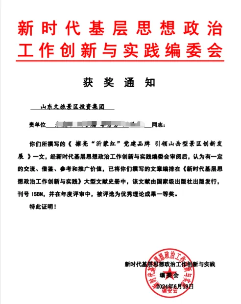 近日,山東文旅景區(qū)集團(tuán)黨委報送的黨建案例《擦亮“沂蒙紅”黨建品牌 引領(lǐng)山岳型景區(qū)創(chuàng)新發(fā)展》經(jīng)黨的基層建設(shè)與思想政治工作成果匯編委會審閱后,正式納入大型文獻(xiàn)史冊——《黨的基層建設(shè)與思想政治工作成果匯編》一書中,并在年度評審中被評為優(yōu)秀理論成果一等獎。