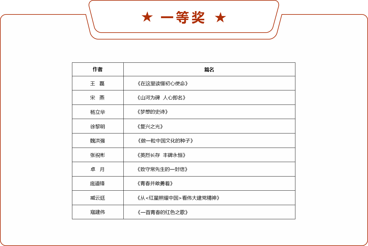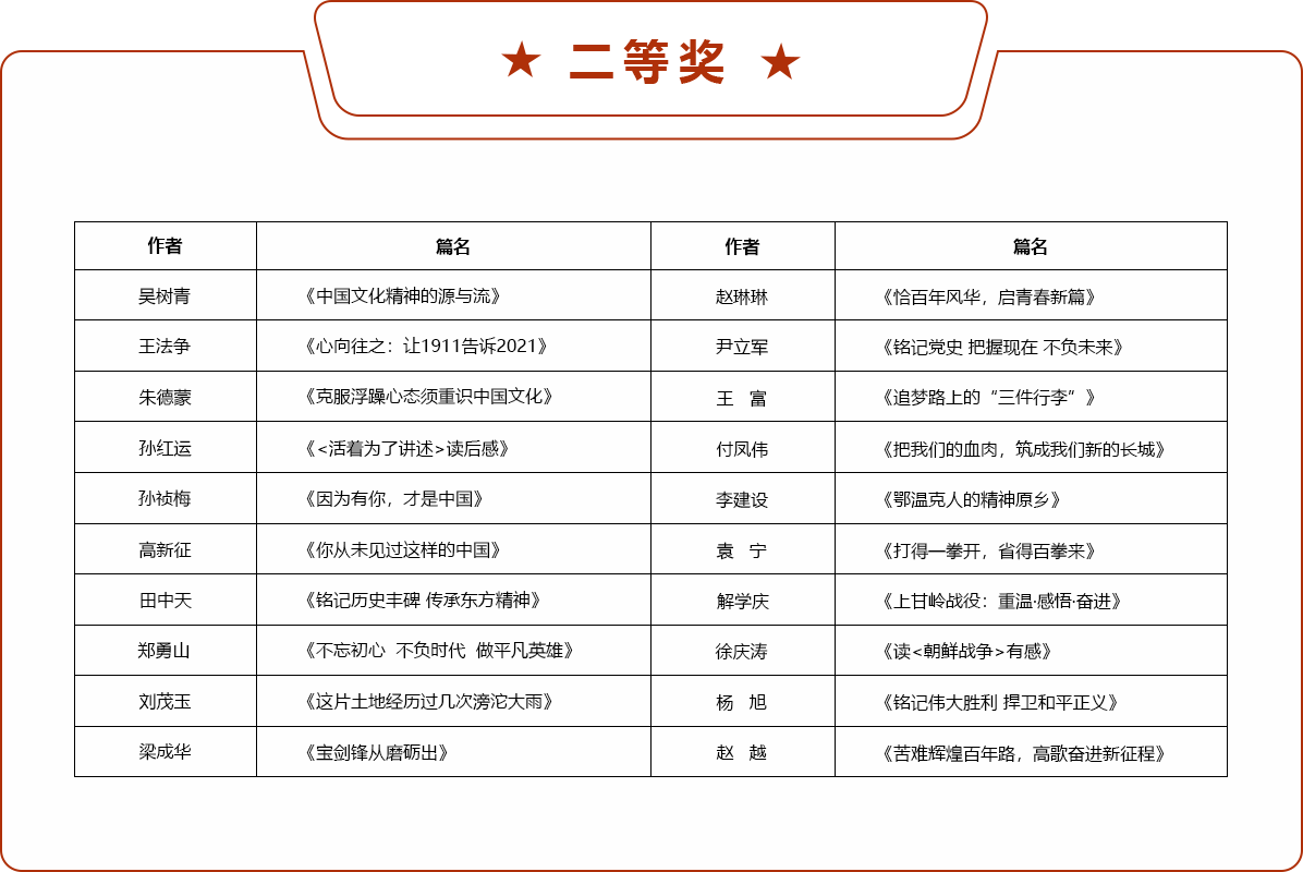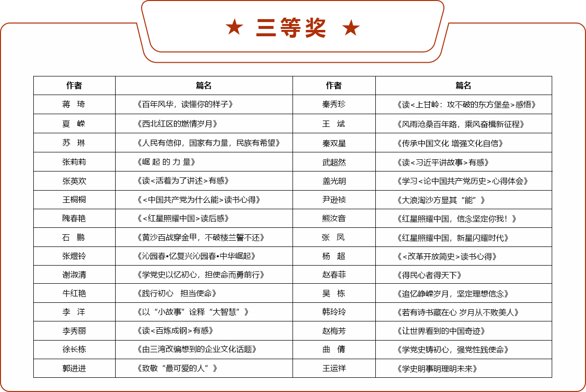 2021年是中國共產(chǎn)黨成立100周年,集團(tuán)黨委黨史學(xué)習(xí)教育領(lǐng)導(dǎo)小組辦公室在全集團(tuán)范圍內(nèi)組織開展了“牢記初心  保持赤心  堅定信心”黨史學(xué)習(xí)讀書競賽活動。經(jīng)初評、復(fù)評及終審三輪評審,審定100篇獲獎作品,其中一等獎10名、二等獎20名、三等獎30名、優(yōu)秀獎40名,共有3家單位榮獲優(yōu)秀組織獎。2022年9月22日在濟(jì)南舉行頒獎典禮。