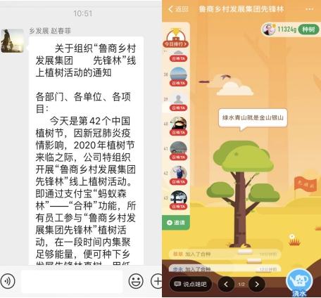 線上植樹,線下收獲。公司借助支付寶“螞蟻森林”線上公益平臺,發(fā)起合種了虛擬的“魯商鄉(xiāng)村發(fā)展集團先鋒林”,動員全體黨員干部職工通過綠色出行、網(wǎng)絡(luò)購票、電子發(fā)票、綠色辦公、線上繳費、綠色政務(wù)等日常低碳行為,收集、澆灌綠色能量,在手機上“澆水種樹”,助力先鋒林順利成長。之后螞蟻森林會在合適的時間,在線下以公司的名義,種下對應(yīng)能量數(shù)值的真樹,并發(fā)放電子合種證書。當前,“手機種樹”不僅成為全社會“共同的事情”,還被認可為公民法定植樹義務(wù)的盡責形式之一。
