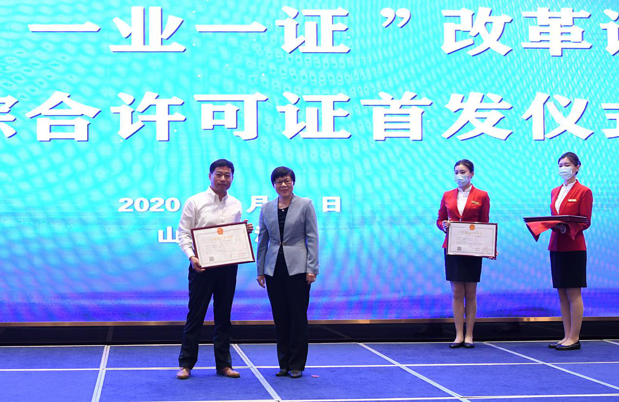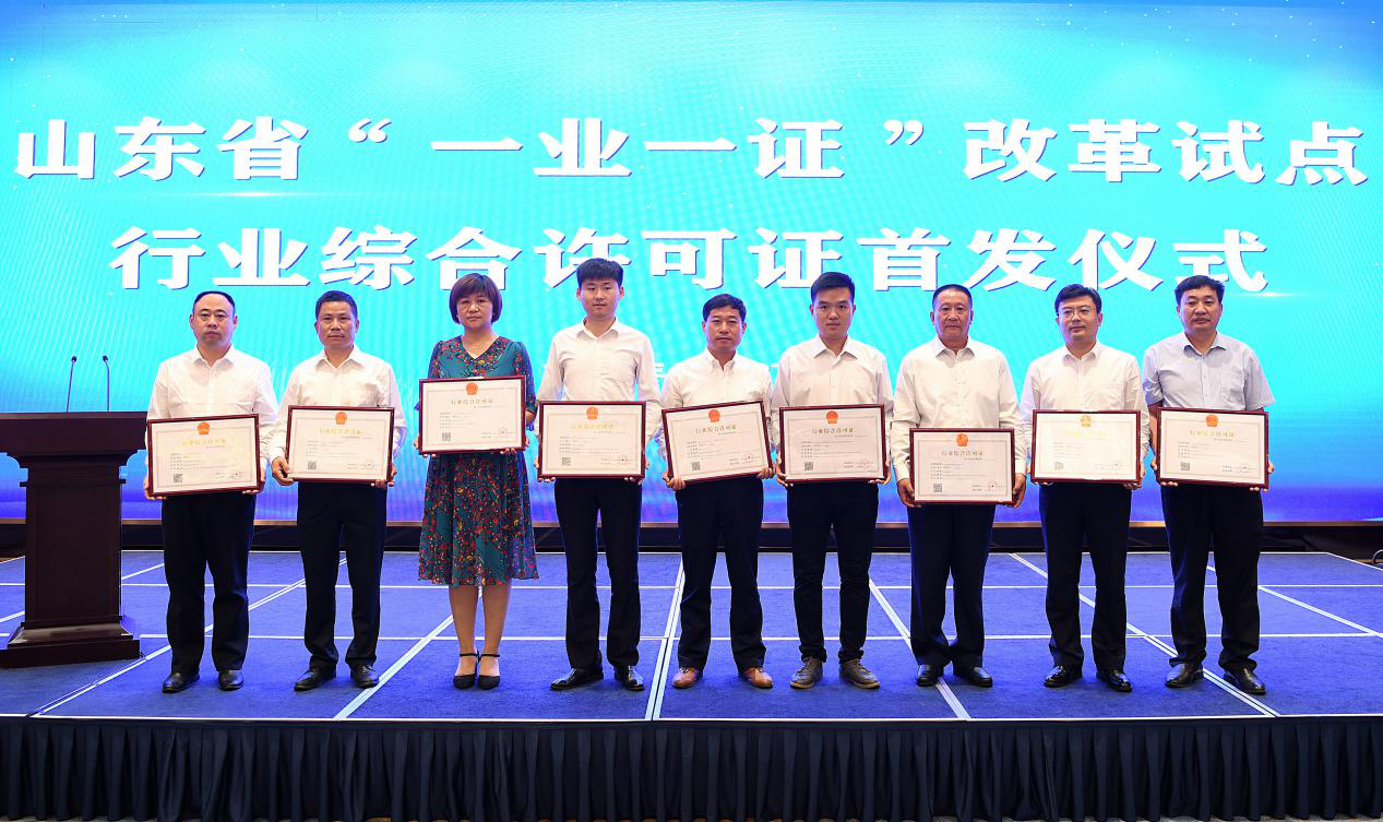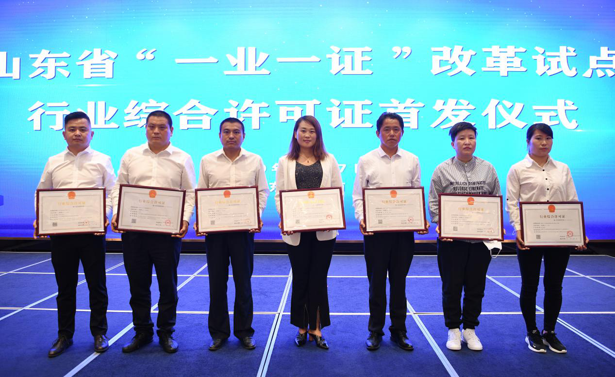 5月27日,山東省“一業(yè)一證”改革試點行業(yè)綜合許可證首證頒發(fā)儀式在濟(jì)南舉行。山東省副省長任愛榮向20個行業(yè)頒發(fā)了行業(yè)綜合許可證,魯商九女峰(泰安)鄉(xiāng)村振興有限公司總經(jīng)理于在武第一個上臺領(lǐng)取許可證。山東首次頒發(fā)行政綜合許可證標(biāo)志著我省“一業(yè)一證”改革邁出了重要的一步,將最大限度減材料、簡環(huán)節(jié)、壓時限,讓企業(yè)群眾少跑腿、不跑腿,是我省深化商事制度改革,破解“準(zhǔn)入不準(zhǔn)營”難題,實現(xiàn)“一窗受理·一次辦好”的重大改革舉措。山東省委常委劉強出席儀式并致辭。