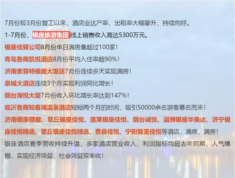 在考驗中奮起,在困局中謀篇。在省商業(yè)集團黨委的領(lǐng)導(dǎo)下,銀座旅游集團改革創(chuàng)新,深挖消費需求,創(chuàng)新營銷模式,加大協(xié)同力度,不斷培育新的利潤增長點。4月份以來,經(jīng)營指標呈現(xiàn)持續(xù)向好態(tài)勢。7月份,銀座旅游集團直營酒店當月利潤環(huán)比增幅達98%。全員助力促發(fā)展,截至目前新簽酒店22家,新開酒店24家,跟進項目20余個。