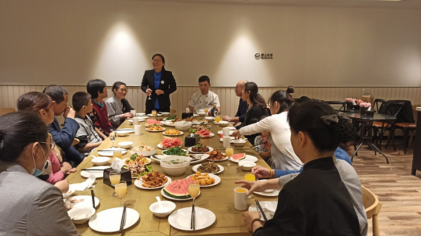 前臺員工李鑫的公婆年近六十,六歲的兒子從小一直由公婆帶著,正因為如此,李鑫才能全副精力做好前臺的管理工作,表現(xiàn)優(yōu)秀,贏得同事、顧客的一致認可??头繂T工鄭兆燕的婆婆今年七十多了,身體很健朗,老人樸實地說著她們婆媳住在一起十幾年從來沒紅過臉,給大家傳授婆媳相處之道。團圓飯席間大家互相敬酒、祝福,氛圍和諧、溫馨。