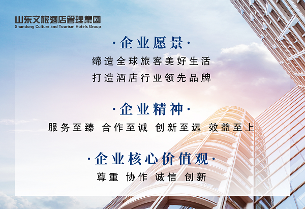未來,山東文旅酒店管理集團將秉持“尊重、協(xié)作、誠信、創(chuàng)新”的企業(yè)核心價值觀,發(fā)揚“服務(wù)至臻、合作至誠、創(chuàng)新至遠、效益至上”的企業(yè)精神,緊緊圍繞酒店主業(yè),走輕資產(chǎn)、資本化、品牌化、合作化、科技化發(fā)展道路,服務(wù)山東大局,服務(wù)人民大眾,積極研究市場與消費趨勢,貼近新時代消費者訴求,打造個性突出、特色明顯的大住宿業(yè)態(tài),彰顯智慧、精品、生態(tài)、開放的格局,用滿意加驚喜的產(chǎn)品和服務(wù),努力讓每一位消費者在山東文旅酒店遇見美好,奮力打造符合大眾消費時代的山東一流、全國知名的現(xiàn)代化酒店管理集團。