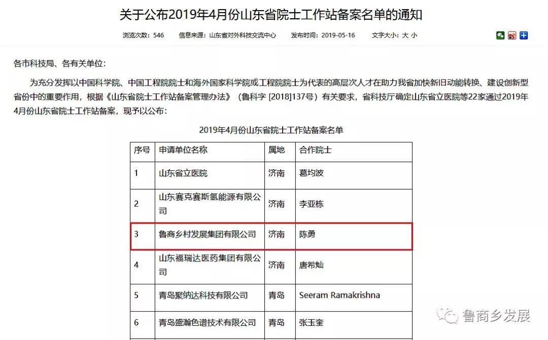 5月16日,省科技廳公布了2019年4月份山東省院士工作站備案名單,魯商鄉(xiāng)村發(fā)展集團有限公司(以下簡稱“公司”)申請備案的“鄉(xiāng)村振興”院士工作站位列其中,成為公司首個省級院士工作站。