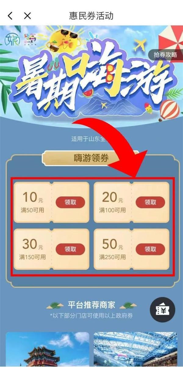 由省文化和旅游廳主辦的第五屆山東文化和旅游惠民消費(fèi)季期間,為更好滿足市民暑期出游需求,“花得少,玩得好”,作為官方指定發(fā)券平臺(tái),云游齊魯智慧文旅平臺(tái)(一部手機(jī)游山東)推出“萬券齊發(fā),惠游齊魯”文旅惠民消費(fèi)活動(dòng)。即日起至10月底,登錄“云游齊魯”APP及微信小程序的惠民消費(fèi)專區(qū),領(lǐng)取專屬文旅惠民消費(fèi)券,即可參與活動(dòng),景區(qū)門票最高優(yōu)惠50元。