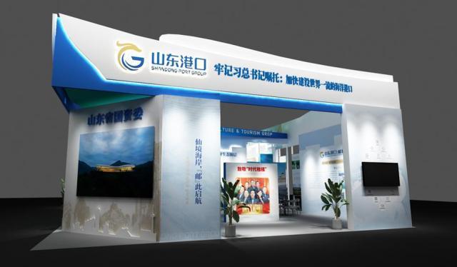 相較去年,今年山東省國資委展區(qū)設計整體色調(diào)采用了藍綠漸變,色彩靈感取自國欣文旅與山東港口兩大集團的logo,漸變?nèi)诤蟿t體現(xiàn)了兩大集團致力于文旅融合的工作方向。內(nèi)部整體設計風格明快、簡約、樸素,同時通過背景與展板造型,著力表現(xiàn)城市與山水風景的有機結合,實現(xiàn)“整體統(tǒng)一,重點突出”的展示效果。