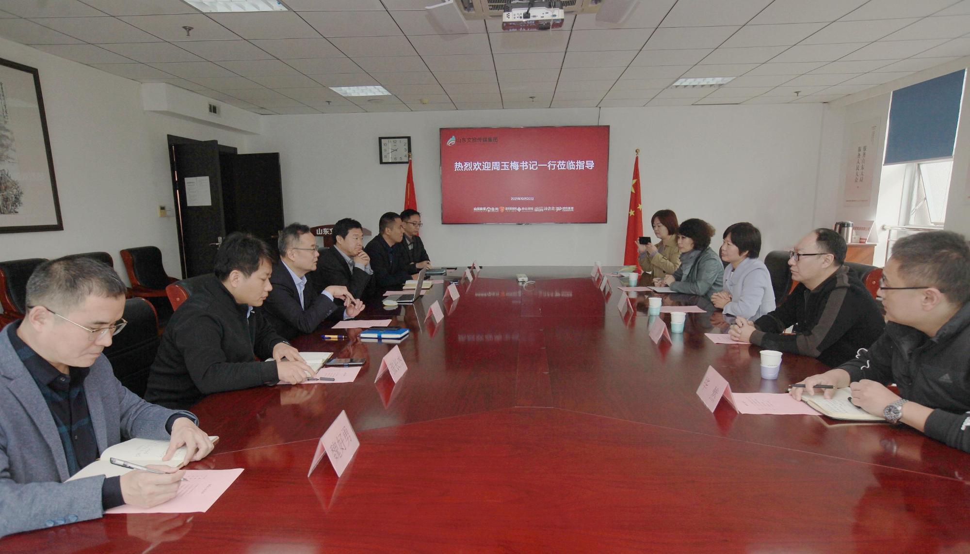10月20日,山東商院文化創(chuàng)意產(chǎn)業(yè)學(xué)院書記周玉梅一行5人到山東文旅傳媒集團(tuán)走訪并進(jìn)行座談交流。山東文旅傳媒集團(tuán)黨委書記、董事長(zhǎng)龐道鋒熱情接待。