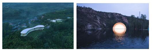 “故鄉(xiāng)的云”利用當(dāng)?shù)卮迕耖e置院落,將山林掩映、山野自然融為一體,最大程度地賦予了居住空間詩(shī)意美學(xué)。“故鄉(xiāng)的月”主體結(jié)構(gòu)與兩側(cè)峭壁巧妙結(jié)合,通過屋頂水面倒影,將屋頂天窗映成了一輪圓月,象征著四方游子對(duì)故鄉(xiāng)的獨(dú)特眷戀。