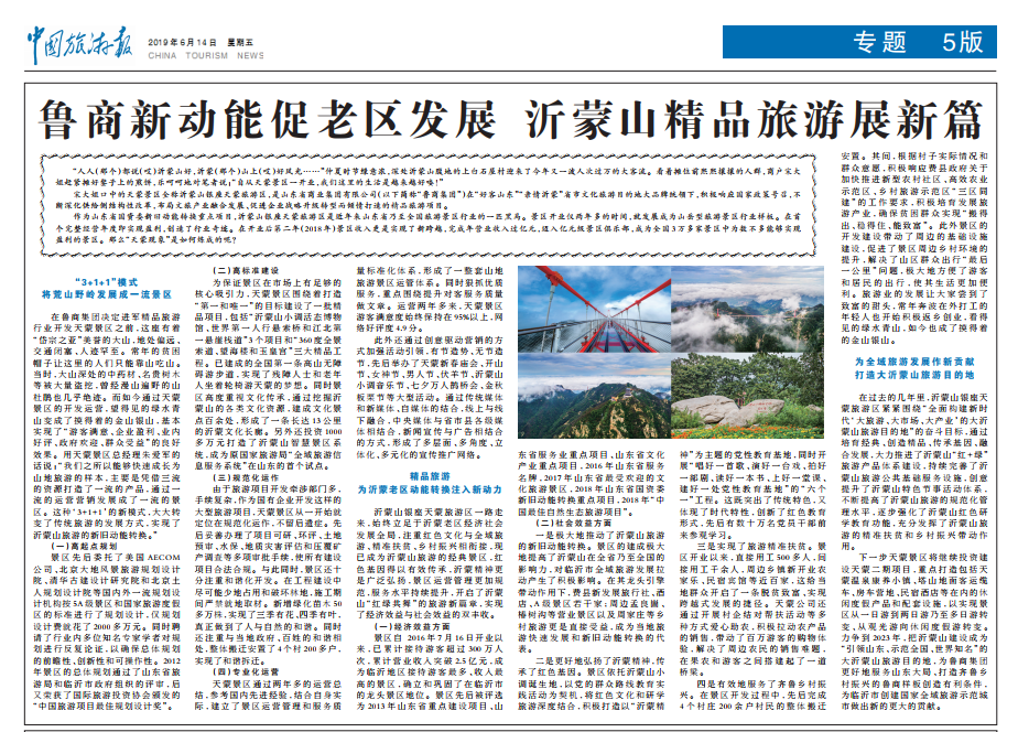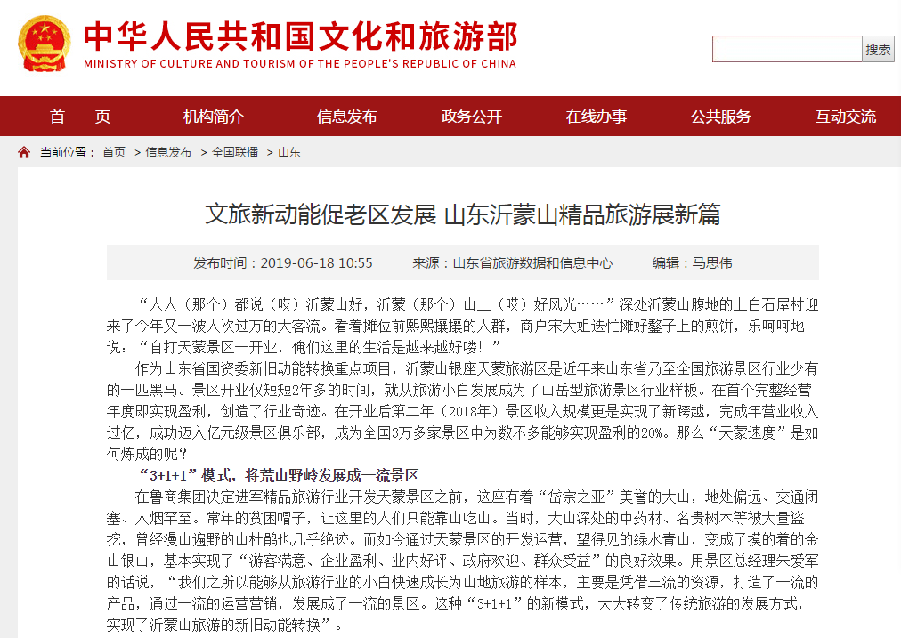 近日,文化和旅游部網(wǎng)站轉(zhuǎn)載中國旅游報文章《魯商新動能促老區(qū)發(fā)展 沂蒙山精品旅游展新篇》,對山東省國資委新舊動能轉(zhuǎn)換重點項目——魯商集團所屬沂蒙山銀座天蒙旅游區(qū)發(fā)展模式進行關(guān)注。以下為報道全文: