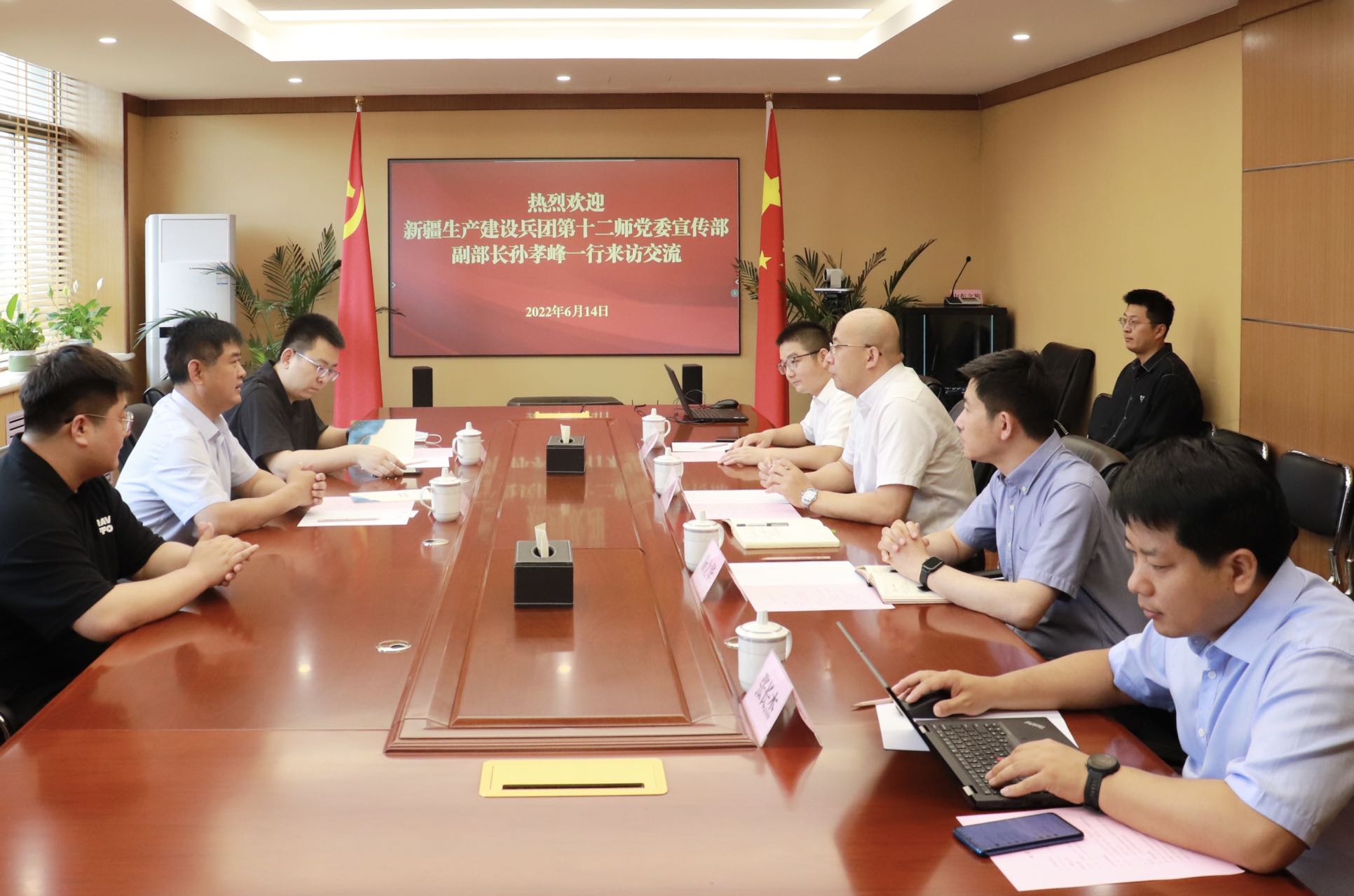 6月14日,新疆生產(chǎn)建設(shè)兵團(tuán)第十二師黨委宣傳部副部長(zhǎng)孫孝峰一行到訪山東文旅集團(tuán),同集團(tuán)黨委委員、副總經(jīng)理孫超座談交流。