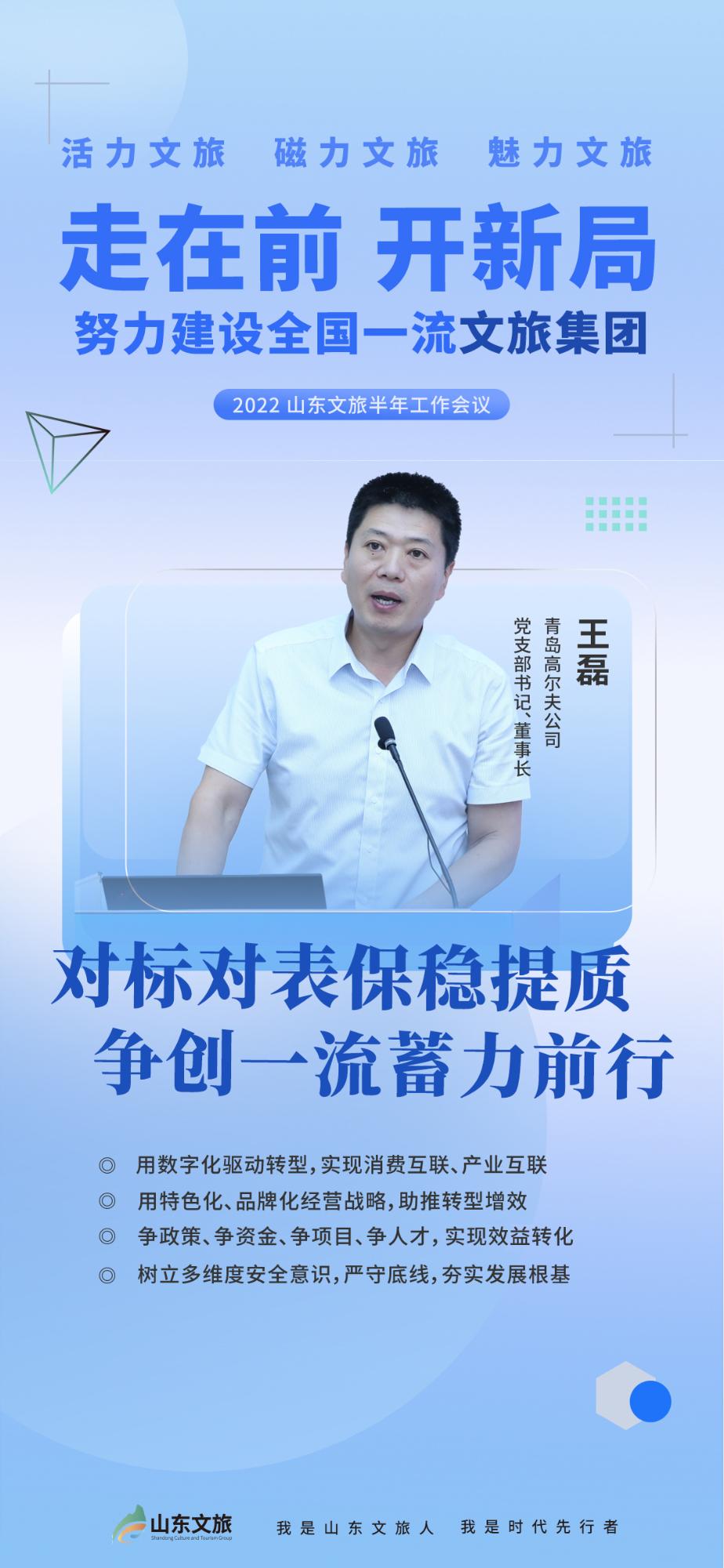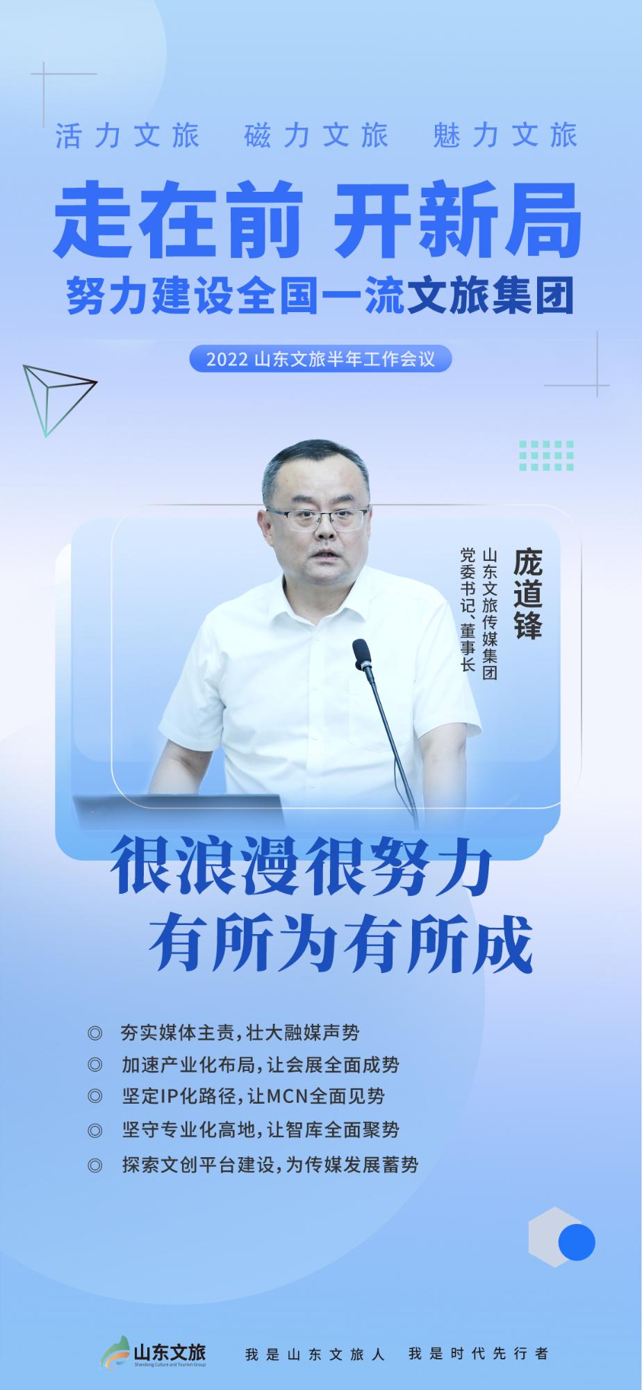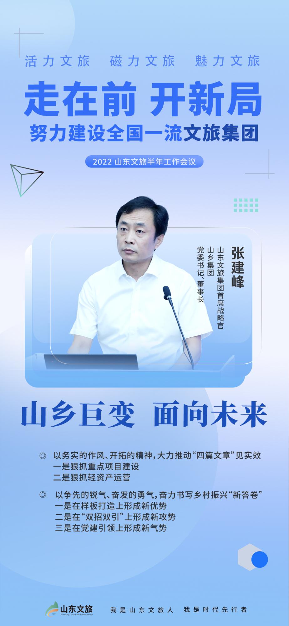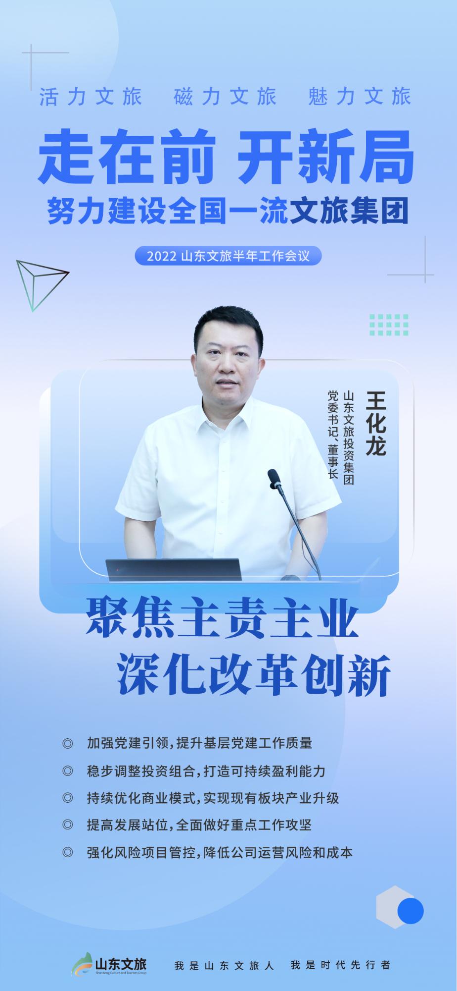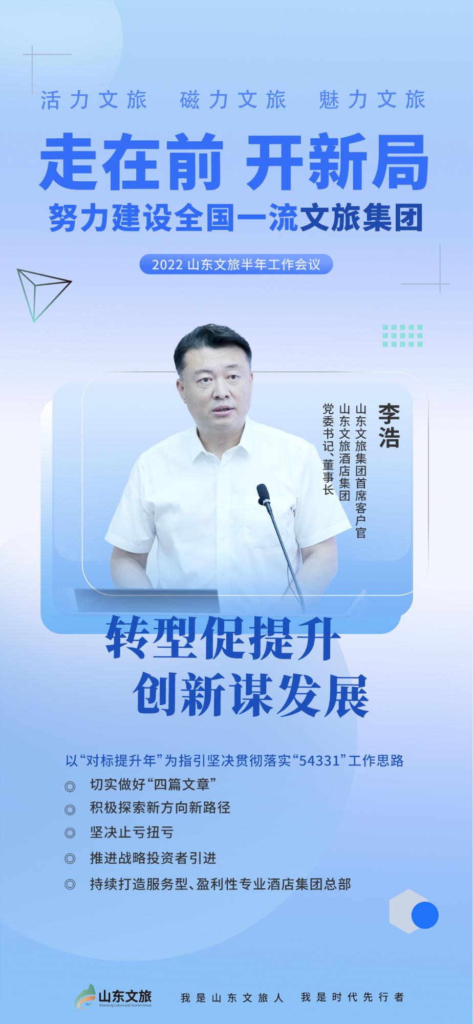 在山東文旅半年經(jīng)濟工作分析會上,集團黨委書記、董事長高洪雷對集團2022年下半年工作進行重點部署,要深入學習貫徹黨的二十大精神,堅持以習近平總書記“三個走在前”的重要指示為根本遵循,以建設現(xiàn)代化經(jīng)濟文化強省為己任,以“對標提升年”為抓手,按照“54331”的工作思路,實施平臺化、智能化、精品化、生態(tài)化、國際化“五大戰(zhàn)略”,做好鄉(xiāng)村振興、黃河戰(zhàn)略、海洋強省、山東手造“四篇文章”,實現(xiàn)由塊到鏈、由投資到投智、由競爭到協(xié)同“三個轉(zhuǎn)變”,形成活力文旅、磁力文旅、魅力文旅“三力文旅”,全力打造具有“世界眼光、國際標準、全國一流、山東特色”的文旅集團。