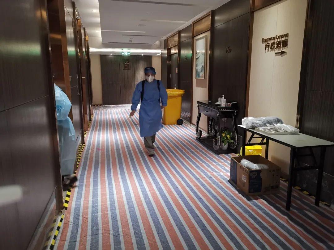 統(tǒng)籌組克服困難,用最短的時(shí)間將3600平方米的公區(qū)按照要求鋪設(shè)地膜進(jìn)行防護(hù);供餐組負(fù)責(zé)為醫(yī)護(hù)人員準(zhǔn)備一日三餐,在此次接待中累計(jì)制作盒飯15884份;保障組負(fù)責(zé)酒店后勤服務(wù)和安全保障工作,他們化身“環(huán)衛(wèi)大白”清理醫(yī)療垃圾;消殺組按照駐店醫(yī)療組專家的意見,專人每天對(duì)各區(qū)域進(jìn)行三次消毒工作,累計(jì)消毒公區(qū)面積28萬余平方米......