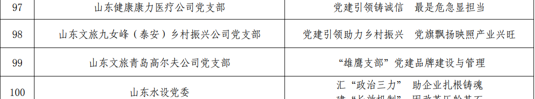 為全面總結(jié)宣傳近年來省屬企業(yè)黨建工作取得的成就,根據(jù)省國資委黨委前期印發(fā)的《關(guān)于開展省屬企業(yè)黨建工作百佳案例評選活動的方案》,經(jīng)組織推薦、初審、評分等程序和環(huán)節(jié),從445個推薦案例中最終評出100個典型案例。其中,由山東文旅集團(tuán)黨委選送的九女峰(泰安)鄉(xiāng)村振興公司黨支部《黨建引領(lǐng)助力鄉(xiāng)村振興 黨旗飄揚(yáng)映照產(chǎn)業(yè)興旺》和青島高爾夫公司黨支部《“雄鷹支部”黨建品牌建設(shè)與管理》案例獲評“省屬企業(yè)黨建工作百佳案例”。