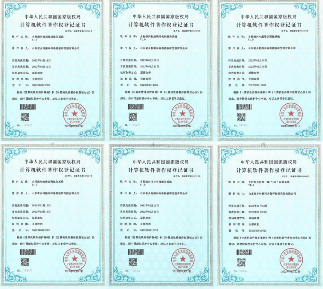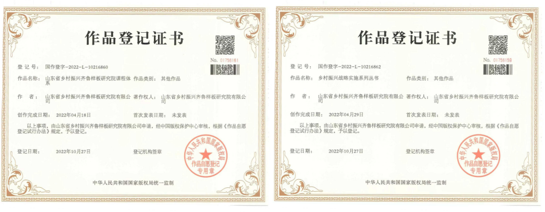 近日,山東省鄉(xiāng)村振興齊魯樣板研究院(簡(jiǎn)稱“研究院”)《鄉(xiāng)村振興戰(zhàn)略系列叢書》《山東省鄉(xiāng)村振興齊魯樣板課程體系》獲得國(guó)家版權(quán)局頒發(fā)的著作權(quán)登記證書,《鄉(xiāng)村振興兩院一體“461”運(yùn)營(yíng)體系》《鄉(xiāng)村振興項(xiàng)目申報(bào)服務(wù)體系》《鄉(xiāng)村振興利益聯(lián)結(jié)機(jī)制服務(wù)體系》《鄉(xiāng)村振興策劃規(guī)劃服務(wù)體系》等6項(xiàng)研究成果獲得國(guó)家版權(quán)局頒發(fā)的計(jì)算機(jī)軟件著作權(quán)登記證書。
