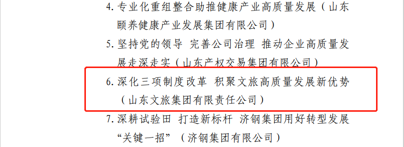 近日,山東省國企改革領(lǐng)導(dǎo)小組辦公室下發(fā)《關(guān)于推廣第五批國企改革三年行動典型經(jīng)驗的通知》,公布省屬企業(yè)改革典型案例推廣名單,山東文旅集團(tuán)報送的《深化三項制度改革 積聚文旅高質(zhì)量發(fā)展新優(yōu)勢》經(jīng)驗案例榜上有名,為集團(tuán)“國企改革三年行動”收官之年寫下精彩的一筆。