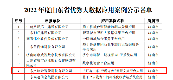 近期,山東文旅云智能科技有限公司(簡稱“文旅云公司”)喜訊頻傳。由文旅云公司承建的“好客山東 云游齊魯”智慧文旅平臺入選山東省工業(yè)和信息化廳組織評選的“三優(yōu)兩重項目”名單(2022年度山東省優(yōu)秀大數(shù)據(jù)應(yīng)用案例),文旅云公司入選山東省工業(yè)和信息化廳組織評選的“2022年度山東省創(chuàng)新型中小企業(yè)”名單。同時,文旅云公司總經(jīng)理曲磊榮獲由山東省數(shù)字經(jīng)濟(jì)協(xié)會評選的2022年度山東省大數(shù)據(jù)產(chǎn)業(yè)“領(lǐng)軍人物”。