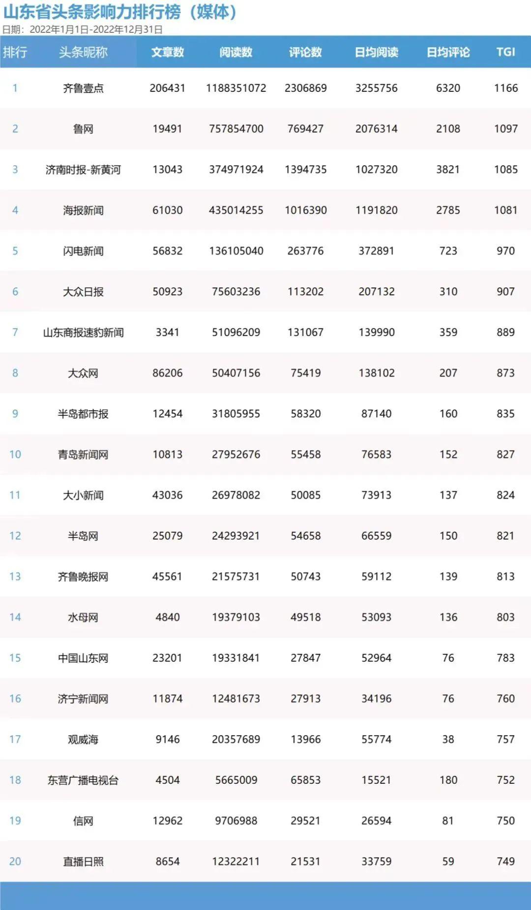 據(jù)了解,該榜單根據(jù)2022年1月1日至12月31日期間,山東省媒體賬號在今日頭條平臺上的發(fā)文數(shù)據(jù)和傳播數(shù)據(jù),綜合頭條號傳播指數(shù)(TGI)公式統(tǒng)計(jì)分析傳播影響力,并以此為依據(jù)得出該平臺最具傳播影響力的TOP20賬號。