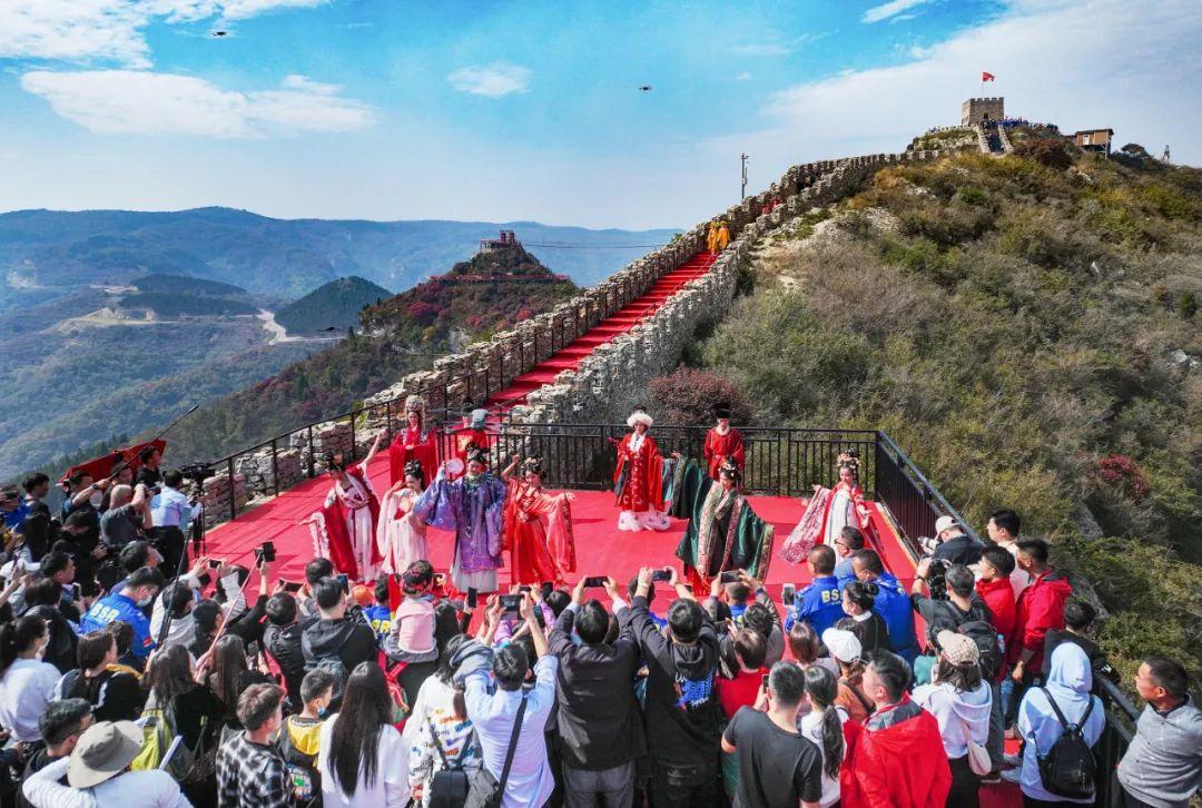 2022年紅葉柿巖第三屆萬畝紅葉季以“長城腳下紅葉濃”為主題,通過展現(xiàn)齊長城腳下村落紅葉秋濃的盛景,以紅葉為引,讓齊文化與古村鎮(zhèn)在文旅融合發(fā)展中煥發(fā)新的生機(jī)與活力?;顒?dòng)現(xiàn)場,“紅葉華彩舞霓裳”國風(fēng)秀展現(xiàn)唐、宋、明三代國風(fēng)服飾亮點(diǎn),百面紅旗迎風(fēng)飄揚(yáng)在斑斕秋色之中,萬畝原生紅葉林競相展艷,近百張照片組成的VR攝影展呈現(xiàn)于齊文化長廊之上,中國紅、柿巖紅相映相融,呈現(xiàn)了一場視覺文化盛宴。