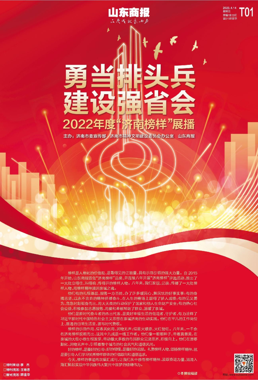 4月14日,山東文旅傳媒集團(tuán)旗下山東商報(bào)推出2022年度“濟(jì)南榜樣”特刊,百版展播“濟(jì)南榜樣”。