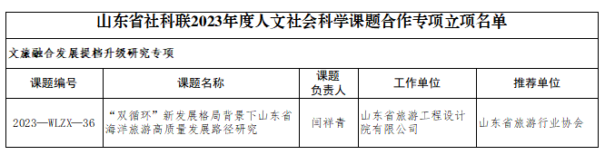 近日,山東省社科聯(lián)公布了2023年度人文社會科學(xué)課題合作專項立項名單,由山東文旅集團(tuán)旗下省旅游設(shè)計院閆祥青、孫曉靜、李猛、于逢荷課題組申報的《“雙循環(huán)”新發(fā)展格局背景下山東省海洋旅游高質(zhì)量發(fā)展路徑研究》獲批立項,課題類別為“文旅融合發(fā)展提檔升級研究專項”,為本年度獲批立項單位中的唯一一家企業(yè)型研究機構(gòu)。