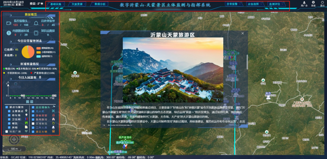 2023年10月20日,國家重點(diǎn)研發(fā)計劃“復(fù)雜山岳景區(qū)游客全域位置感知與精準(zhǔn)服務(wù)”應(yīng)用運(yùn)行啟動儀式在天蒙景區(qū)舉辦。經(jīng)過兩個多月的應(yīng)用實(shí)踐,北斗項目研究成果“數(shù)字沂蒙山-天蒙景區(qū)立體監(jiān)測與指揮系統(tǒng)”及“天蒙導(dǎo)覽微信小程序”取得了顯著的成果。