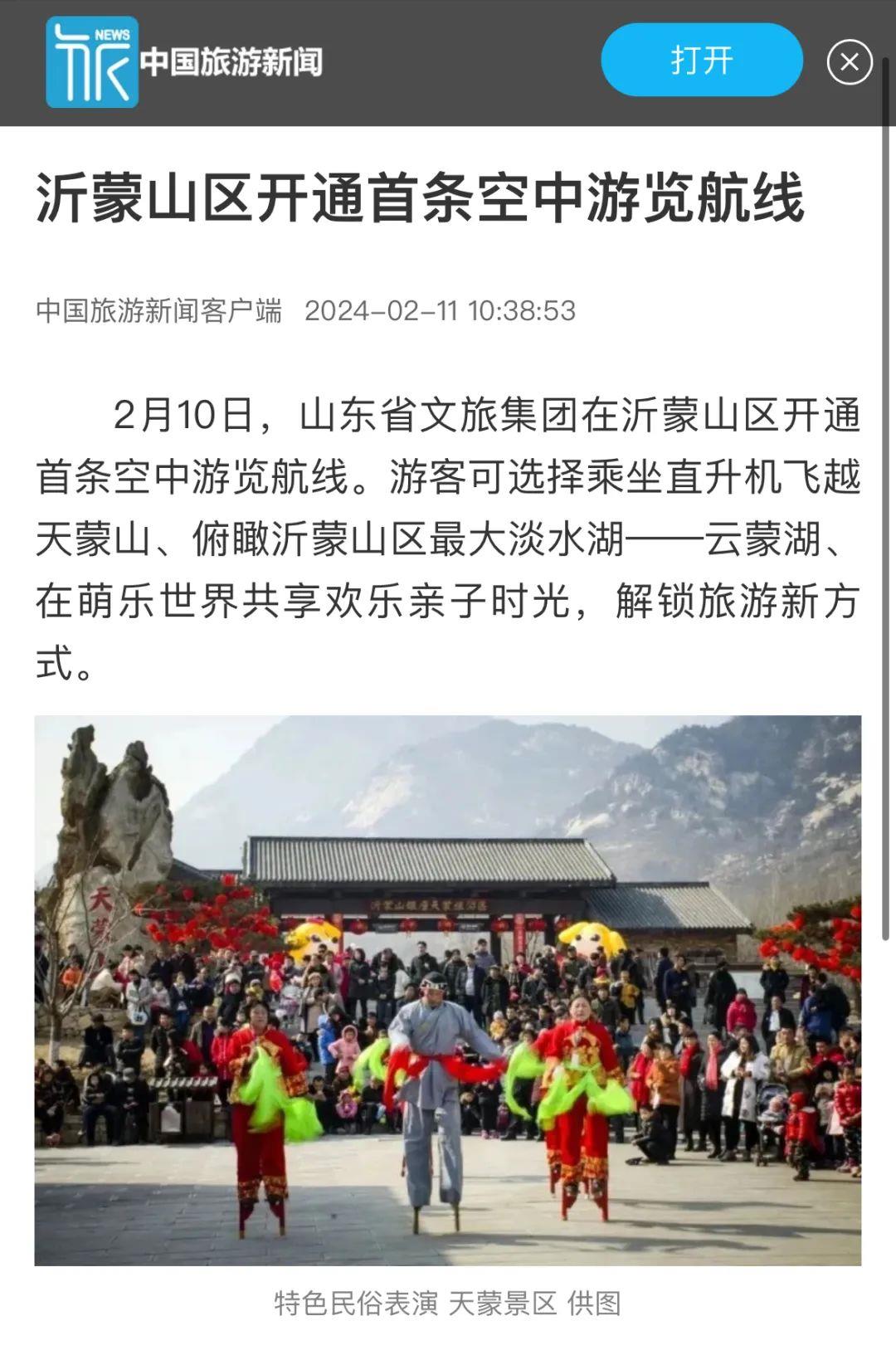 飛天瞰云享萌樂,“山東首條空中游覽航線”正式通航,游客可以乘坐直升飛機從天蒙景區(qū)飛越至云蒙明珠景區(qū)、萌樂世界旅游區(qū),俯瞰沂蒙好風(fēng)光,欣賞大型水舞秀——云蒙明珠之夜。