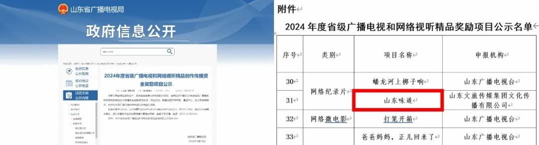 近日,山東省廣播電視局組織開展2024年度省級廣播電視和網(wǎng)絡視聽精品創(chuàng)作傳播資金獎勵項目的申報、評選工作。由山東省商務廳、山東文旅集團出品,山東文旅傳媒集團、山東文旅傳媒集團文化傳播有限公司、山東映訊文化傳播有限公司聯(lián)合出品的山東風味系列美食紀錄片《山東味道》在眾多申報項目中脫穎而出,入選2024年度省級廣播電視和網(wǎng)絡視聽精品創(chuàng)作傳播資金獎勵項目。