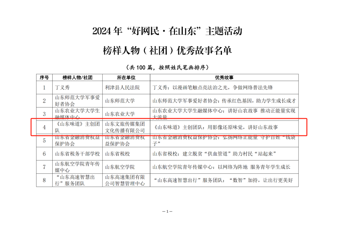 山東文旅傳播出品的大型系列美食紀(jì)錄片《山東味道》榮獲2024年“好網(wǎng)民· 在山東”榜樣人物(社團(tuán))優(yōu)秀故事獎(jiǎng)。2024年“好網(wǎng)民?在山東”主題活動(dòng)由省委網(wǎng)信辦、省總工會(huì)、團(tuán)省委、省婦聯(lián)、省教育廳、省衛(wèi)生健康委、省國(guó)資委、中國(guó)人民銀行山東省分行、省稅務(wù)局、中國(guó)鐵路濟(jì)南局集團(tuán)有限公司主辦,聚焦愛國(guó)主義精神、網(wǎng)絡(luò)法治觀念、文明用網(wǎng)習(xí)慣、網(wǎng)絡(luò)安全技能、責(zé)任擔(dān)當(dāng)意識(shí)等基本素養(yǎng)的新時(shí)代好網(wǎng)民。