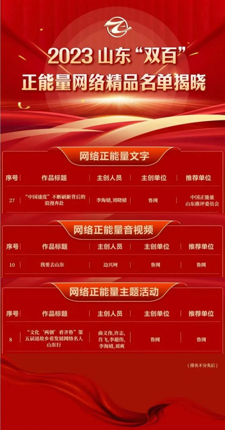 由山東省委網(wǎng)信辦主辦的2023山東“雙百”正能量網(wǎng)絡(luò)精品評(píng)選中,魯網(wǎng)作品《“中國(guó)速度”不斷刷新背后的浪漫奔赴》《我要去山東》《“文化‘兩創(chuàng)’看齊魯”第五屆返故鄉(xiāng)看發(fā)展網(wǎng)絡(luò)名人山東行》分獲網(wǎng)絡(luò)正能量文字、網(wǎng)絡(luò)正能量音視頻與網(wǎng)絡(luò)正能量主題活動(dòng)獎(jiǎng)項(xiàng)。