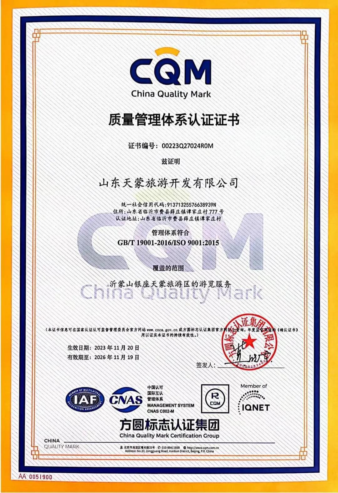 一直以來,天蒙景區(qū)從戰(zhàn)略高度將“標(biāo)準(zhǔn)化引領(lǐng)服務(wù)質(zhì)量提升”的理念貫穿于景區(qū)發(fā)展的全過程。景區(qū)在2019年通過省級服務(wù)標(biāo)準(zhǔn)化試點項目驗收的基礎(chǔ)上,于2021年成功立項了國家級服務(wù)業(yè)標(biāo)準(zhǔn)化試點項目并于2024年順利驗收;于2023年順利通過了ISO9001質(zhì)量管理體系認證。