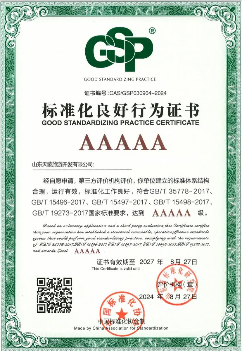 近日,山東天蒙旅游開發(fā)有限公司獲評5A級“標(biāo)準(zhǔn)化良好行為企業(yè)”,成為山東省文旅行業(yè)第一家獲此殊榮的企業(yè)。