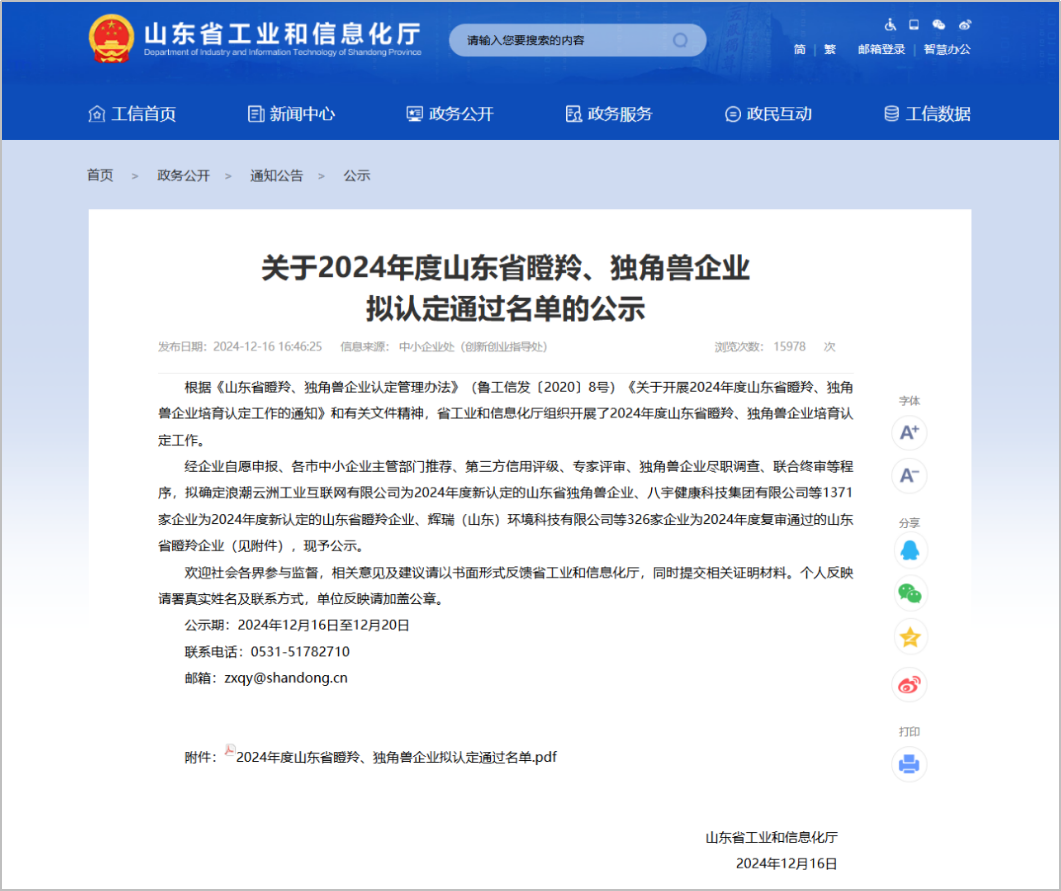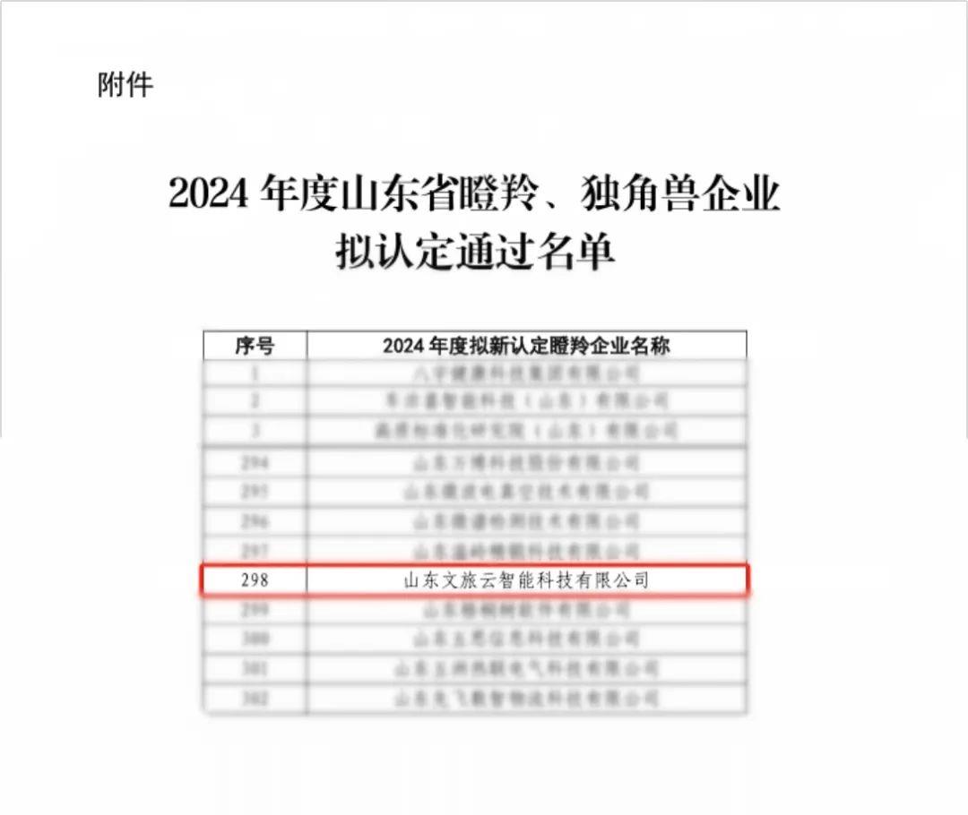 近日,山東省工業(yè)和信息化廳公布關(guān)于2024年度山東省瞪羚、獨角獸企業(yè)名單,山東文旅云智能科技有限公司(簡稱“文旅云公司”)成功入選“2024年度山東省瞪羚企業(yè)”。