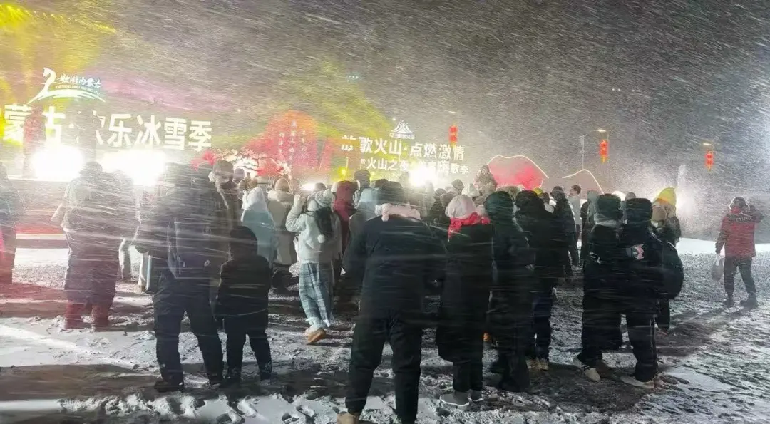 內(nèi)蒙古烏蘭察布火山景區(qū)新年“歌游內(nèi)蒙古·歡樂冰雪季”放歌火山·點(diǎn)燃激情——烏蘭察布“火山之夜”游客嗨歌季活動(dòng)激情上演,現(xiàn)場(chǎng)氣氛熱烈。大量游客欣賞萬年火山的同時(shí),品嘗當(dāng)?shù)靥厣就炼沟让朗?,圍聚在炭火旁享受溫暖,非遺火壺表演與煙花秀輪番上演,帶來視覺盛宴,新春佳節(jié)氣息在火山草原愈發(fā)濃厚。