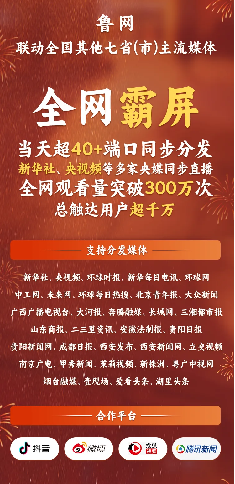 此次活動(dòng)由山東文旅傳媒集團(tuán)旗下魯網(wǎng)聯(lián)合華商網(wǎng)、東南網(wǎng)、華龍網(wǎng)、新疆廣播電視臺(tái)、頂端新聞、貴陽網(wǎng)、紫金山視頻等全國(guó)八省、市主流媒體共同發(fā)起,邀請(qǐng)來自山東、陜西、福建、貴州、重慶、新疆、河南、江蘇各地的大廚名師參加,通過網(wǎng)絡(luò)直播形式展示各地一涼一熱兩道經(jīng)典菜品做法,傳承優(yōu)秀傳統(tǒng)文化,營(yíng)造喜慶春節(jié)氛圍,共賀首個(gè)非遺新年。本次直播還得到新華社、央視頻、環(huán)球時(shí)報(bào)、新華每日電訊、環(huán)球網(wǎng)、中工網(wǎng)、未來網(wǎng)、環(huán)球每日熱搜、北京青年報(bào)等中央、省市主流媒體的多平臺(tái)轉(zhuǎn)播支持,全國(guó)超過40個(gè)傳播端口同步分發(fā),直播全網(wǎng)觀看量突破300萬次,總觸達(dá)用戶超千萬,實(shí)現(xiàn)全網(wǎng)“霸屏”。