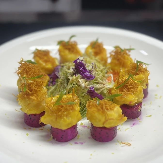 怡豪大飯店彩虹色系的“五彩撈汁拌蜇頭”,搭配油醋汁,輕盈零負(fù)擔(dān)。臨沂鉑爾曼大酒店“芝麻菜腰果果蔬沙拉”,以火龍果花束造型驚艷亮相。菏澤頤庭華美達(dá)酒店輕脂改良版的“清燉鮰魚獅子頭”,用魚肉替代豬肉更健康。淄博華美達(dá)大酒店的“輕脂四鮮翡翠炒”,蝦仁邂逅荷蘭豆,橄欖油快炒保留脆嫩清香。